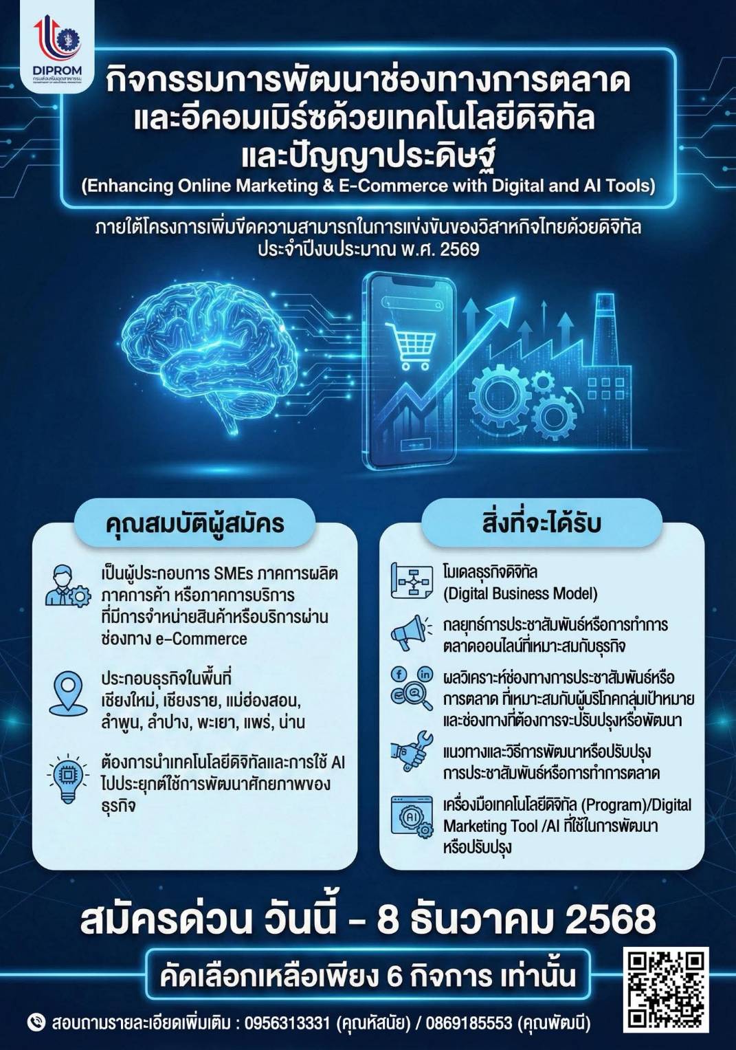 ศูนย์ส่งเสริมอุตสาหกรรมภาคที่ 1 กรมส่งเสริมอุตสาหกรรม ขอเชิญชวนผู้ประกอบการ SME สมัครเข้าร่วม กิจกรรมการพัฒนาช่องทางการตลาดและอีคอมเมิร์ซด้วยเทคโนโลยีดิจิทัลและปัญญาประดิษฐ์